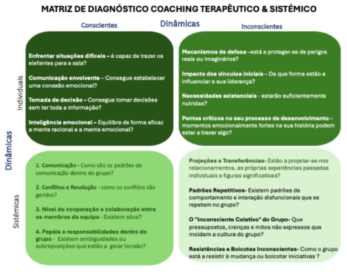 Para facilitar a compreensão desta abordagem diagnóstica, apresentamos a matriz de diagnóstico Coaching Terapêutico & Sistémico que orienta a nossa intervenção.